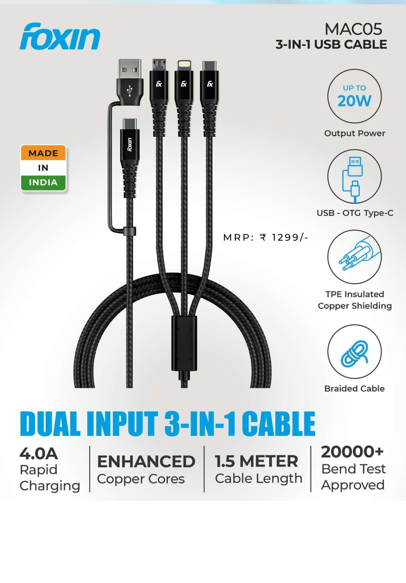This 3-in-1 charging cable supports dual input (USB-A & Type-C) and delivers up to 4.0A fast charging for multiple devices.