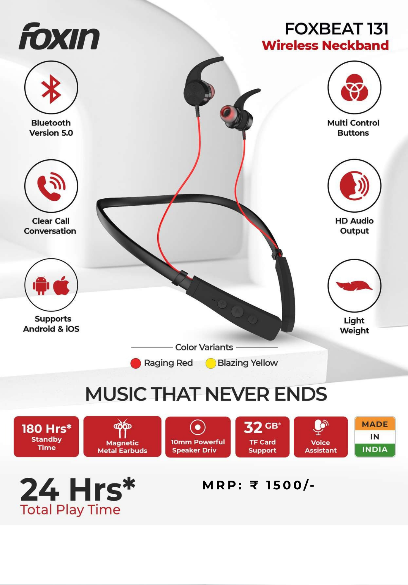 Bluetooth 5.0 neckband offers a stable and fast wireless connection for smooth music and call experience. It delivers powerful bass with clear sound output, making it ideal for everyday use. The lightweight and flexible neckband design ensures comfortable wearing even for long hours. With a built-in microphone, it supports clear hands-free calling on the go.